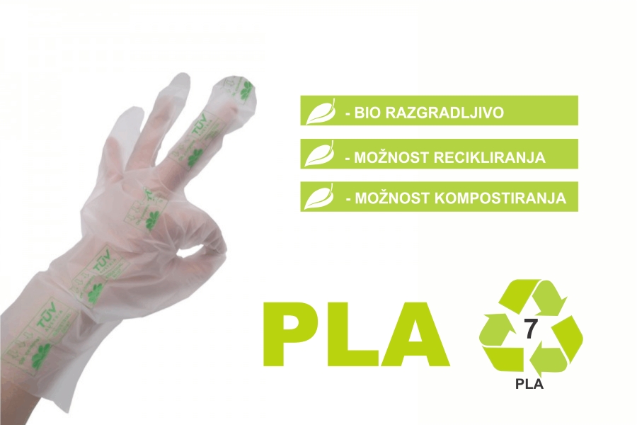 V prihodu imamo rokavice za enkratno uporabo narejene iz PLA. Pollaktična kislina, najpogosteje znana kot PLA, je polimer iz obnovljivih virov. V nasprotju z drugimi termoplasti, ki temeljijo na nafti, se za proizvodnjo PLA uporabljajo predvsem koruzni škrob, korenine tapioke ali sladkorni trs. Njegove lastnosti so primerljive z drugimi plastičnimi materiali v industriji. Material je BIO razgradljiv ima možnost kompostiranja in recikliranja.